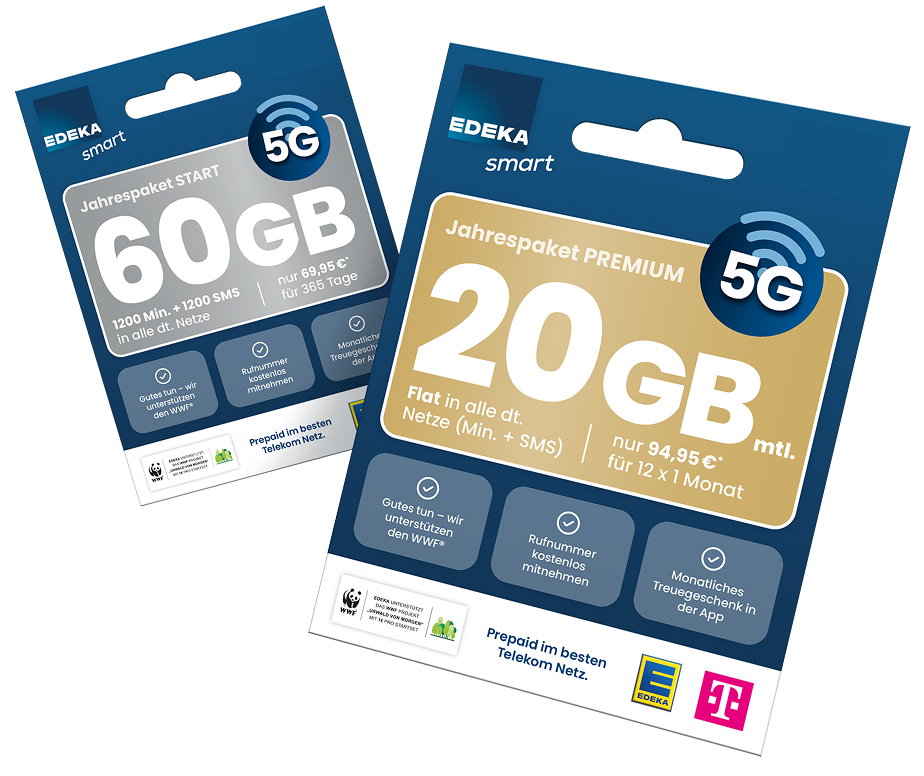 Nachhaltiger Mobilfunk wird bei uns großgeschrieben: EDEKA smart unterstützt das WWF-Waldschutzprogramm mit einem Euro je verkauftem Starterset. Die Verpackung besteht aus Graspapier – mit 75 % weniger CO₂-Emissionen bei der Herstellung gegenüber anderen Pappschachteln. Außerdem kommt für das Handynetz nur Strom aus 100 % erneuerbaren Energien zum Einsatz. So schützen wir die Umwelt durch eine möglichst hohe Nachhaltigkeit und einen geringen ökologischen Fußabdruck.